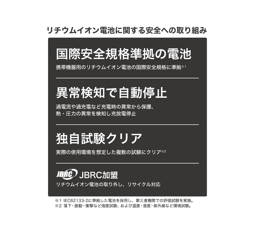 従来通り、内蔵しているリチウムイオン電池は国際規格(IEC62133-2)に準拠したリチウムイオン電池を採用し、各種保護回路による安全制御設計と独自の信頼性試験を実施。一般社団法人JBRC加盟企業として、リサイクルにも取り組んでいます。