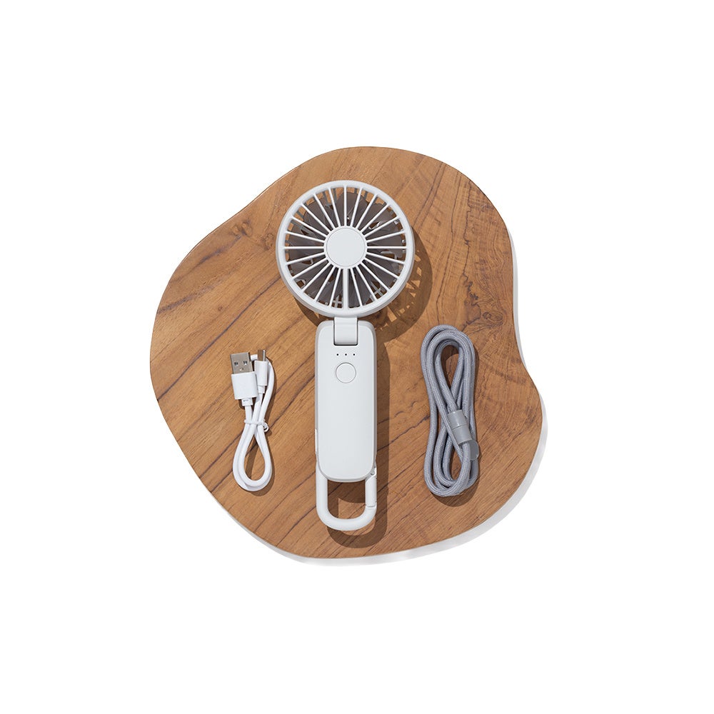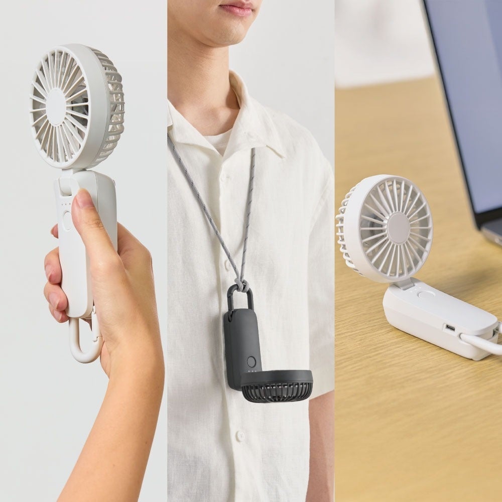 本体を置きファン部を立てる事でデスクファンとして、付属のネックストラップを使用してハンズフリーでもご使用いただけます。