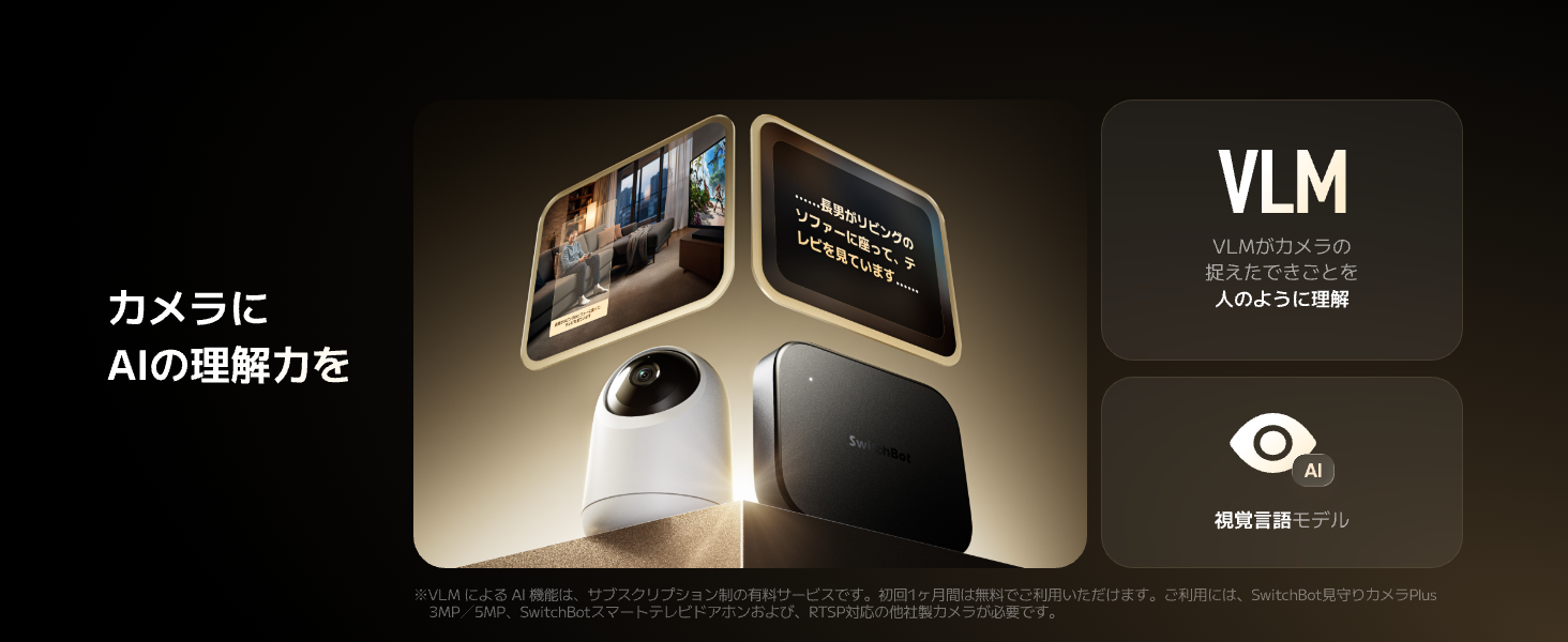 SwitchBot App から RTSP 対応カメラ全ての接続に対応、SwitchBot VLM サービスも RTSP 対応カメラ全て対応。 |