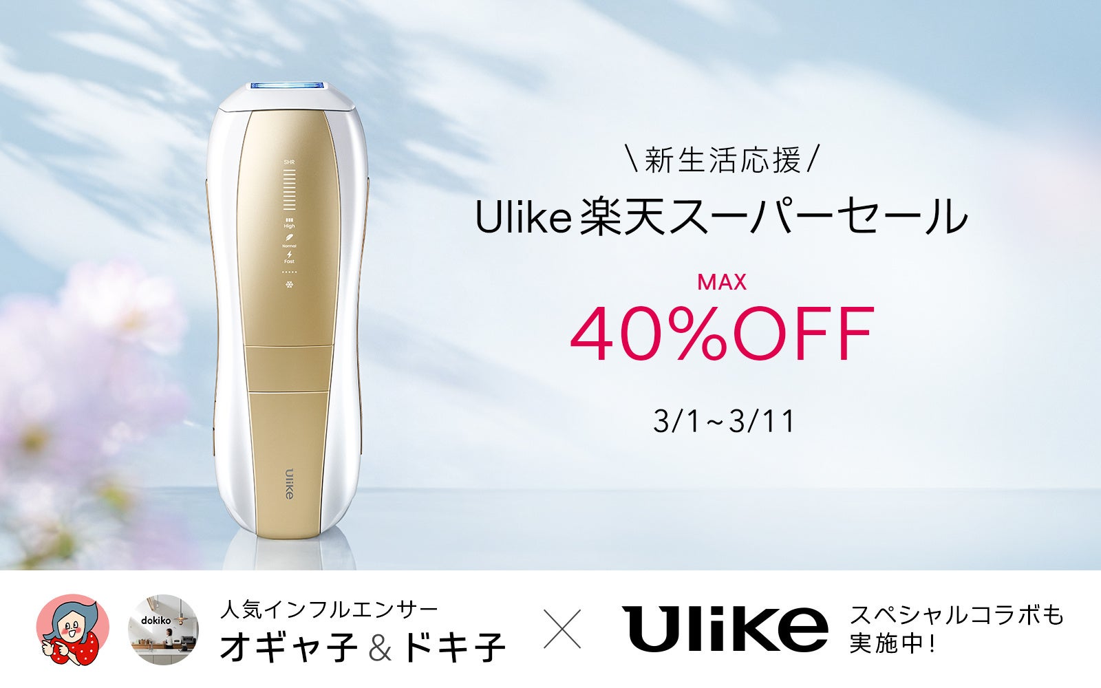 家庭用美容機器メーカー「ユーライクジャパン株式会社」(本社:東京都港区)が展開する、家庭用光美容器3年連続世界No.1(*1)ブランド「Ulike(ユーライク)」は、3月4日(水)20時00分から開催される『楽天スーパーSALE』に先行して、ULIKE CARE楽天市場店にて3月1日(日)0時00分よりベストセラーモデルや脱毛に最適なモデルなど、最大40%オフの割引率で販売いたします。