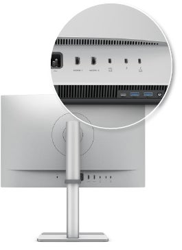 MA320UGとMA270Sは、1つのThunderbolt 4(96W供給)ポートの他に、1つのUSB-C(35W給電)ポート、2つのHDMIポートを搭載し、様々な接続デバイスの映像入力切り替えができます。さらに、もう1つのThunderbolt 4(15W給電)と1つのUSB-C(15W給電)で、iPadやiPhoneなどのデバイスへも充電もできます。また、MA320UGとMA270Sは2画面を接続するデイジーチェーンにも対応しています。