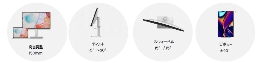 また、MacBookを手前に置いてもモニター画面に重ならない高さに調整できるスタンド設計や、ティルト・スウィーベル・ピボットにも対応したエルゴノミクスデザインによって、ユーザーのデスク環境に合わせて柔軟に調整できます。スタンドベースのラバーパッドは、MacBookやアクセサリーなどの収納置き場として、傷つけることなくフィットします。