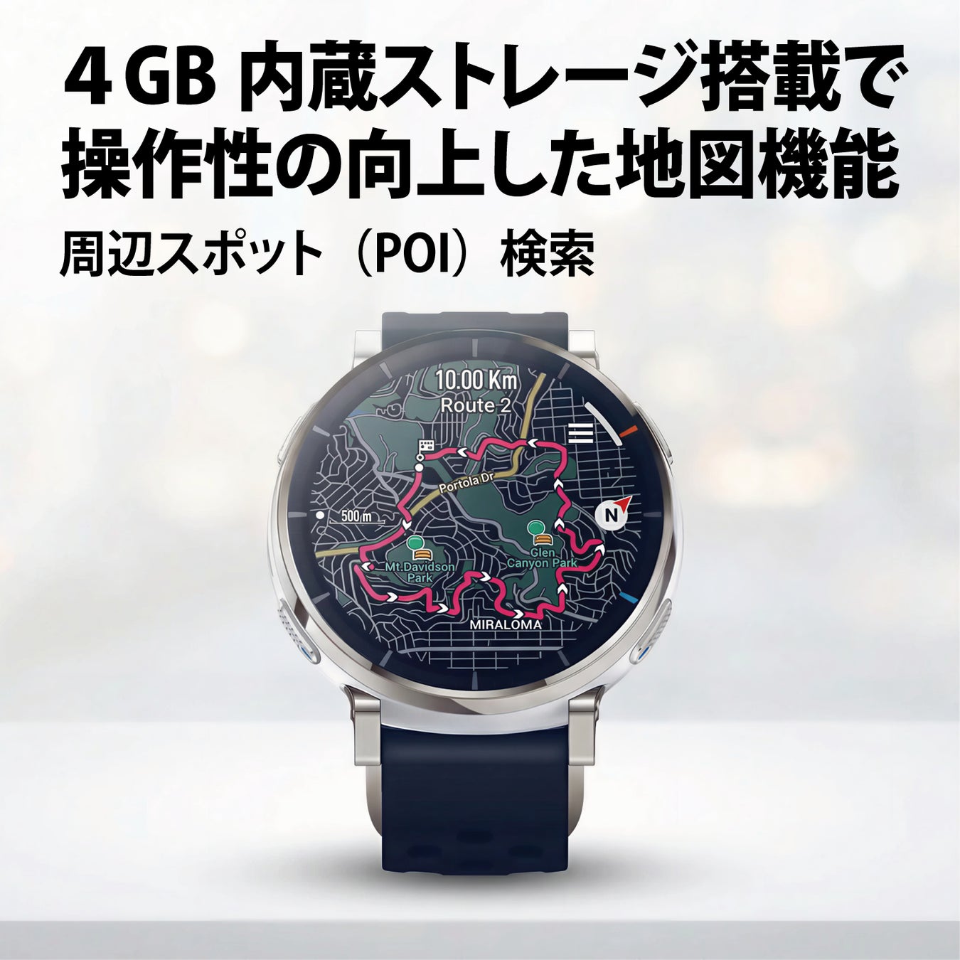 ダウンロード可能なベースマップ(街路)、等高線、スキーリゾートマップに対応。ターンバイターン方式のルート案内、オフラインでのポイントツーポイントルートプランニング、近隣のPOI(興味のある場所)、自動ルート変更機能を搭載しています。