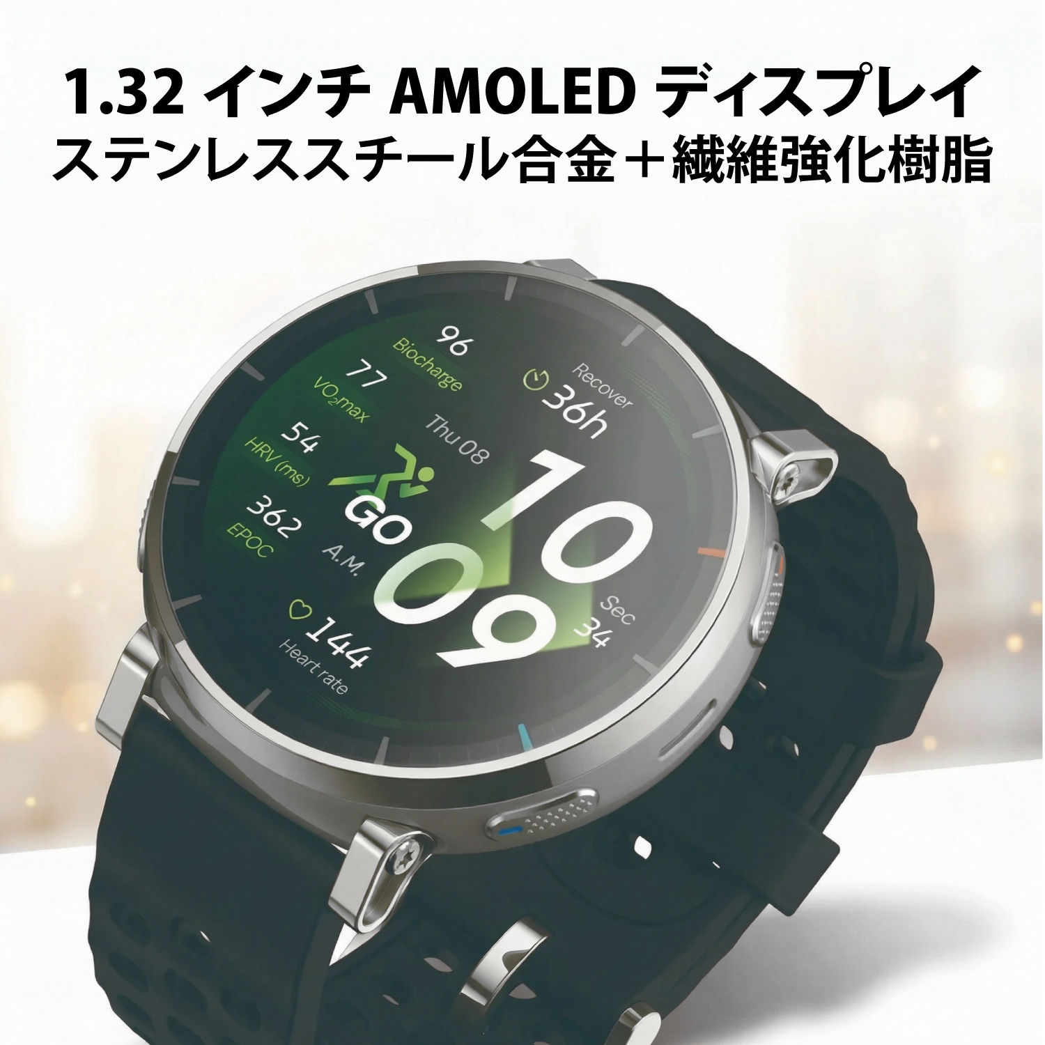 1.32インチのAMOLEDディスプレイで最大輝度3,000nitを実現し、直射日光下でも鮮明な視認性を確保。サファイアガラスカバーを採用し、耐擦傷性を向上。グローブモードにも対応しています。4ボタンインタラクションにより、運動中でも正確な操作が可能です。