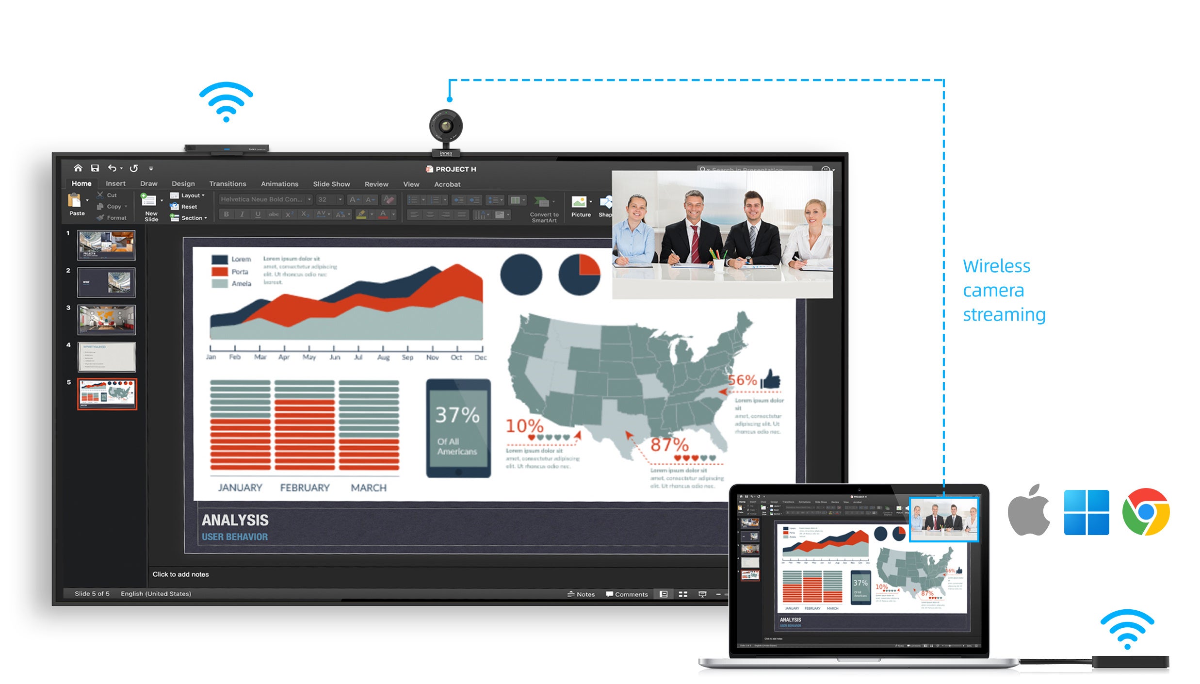 面倒な配線や設定は不要!ワンクリックで、Web会議やプレゼンをスマートに。