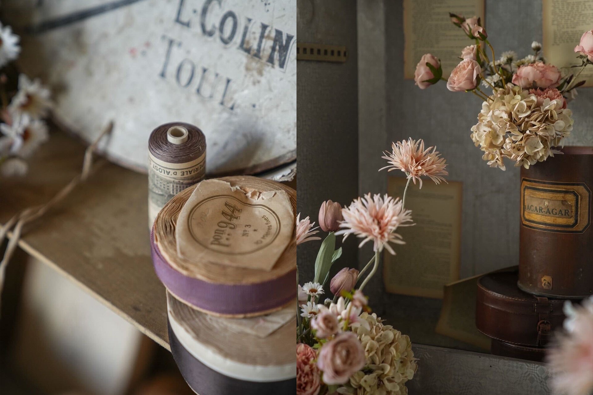 長年使いこまれた風合いのトランクケースに、古い紙もの、古書、革小物など、一つひとつが本物のアンティークで構成された空間が時を感じさせ、ここで撮影をするお客さまそれぞれの物語を連想してくれます。