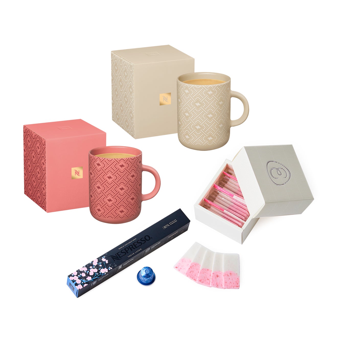 この時期だけの記念コーヒーセットは、「オリジナル」向けと「ヴァーチュオ」向けの2種をご用意しています。伝統的なエスプレッソ体験を提供する「オリジナル」向けセットには、1720年にイタリアで誕生した歴史あるコーヒーハウス「カフェ フローリアン」とのコラボレーションによる特別な一杯「ネスプレッソ | カフェ フローリアン」や、日本で親しまれる味わいやコーヒー文化を尊重し表現した「トウキョウ ルンゴ」を含む3種をラインアップしています。一方、ラージサイズを中心に、豊かなクレマ(※1)と芳醇な味わいの本格的なコーヒー体験を提供する「ヴァーチュオ」向けセットには、マグ、エスプレッソ、ダブルエスプレッソなど、多様なカップサイズやミルクレシピでお楽しみいただける4種の味わいをセレクトしました。また、ブランドの変わらぬ芸術性と情熱を体現した40周年限定デザインのマグカップや、「トウキョウ ルンゴ」をイメージしたブルーカラーのカップに40周年の特別なメッセージと桜のデザインを刻印した 「ピクシー ルンゴカップ トウキョウ」と合わせてコーヒーをお楽しみいただけるセットも販売いたします。