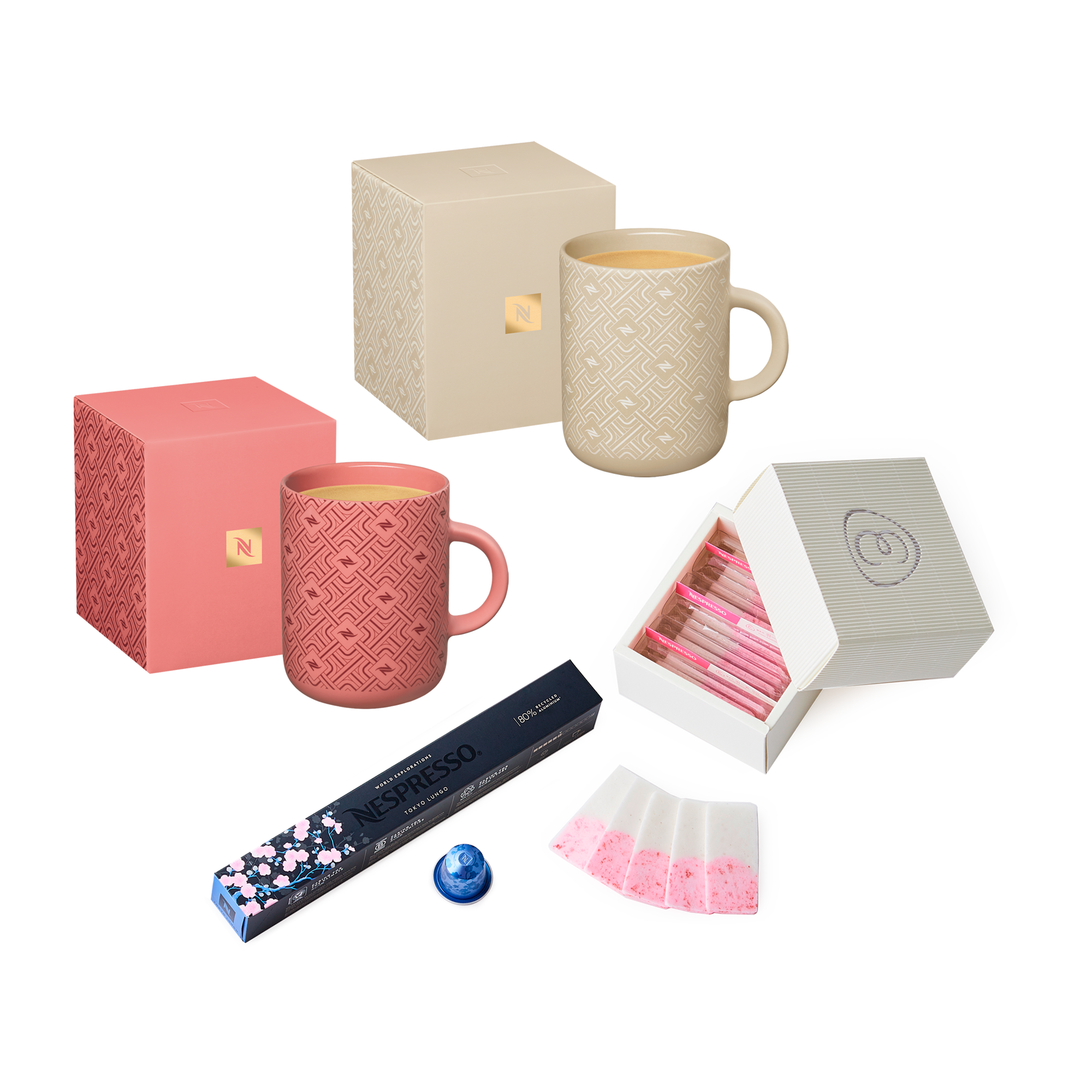 この時期だけの記念コーヒーセットは、「オリジナル」向けと「ヴァーチュオ」向けの2種をご用意しています。伝統的なエスプレッソ体験を提供する「オリジナル」向けセットには、1720年にイタリアで誕生した歴史あるコーヒーハウス「カフェ フローリアン」とのコラボレーションによる特別な一杯「ネスプレッソ | カフェ フローリアン」や、日本で親しまれる味わいやコーヒー文化を尊重し表現した「トウキョウ ルンゴ」を含む3種をラインアップしています。一方、ラージサイズを中心に、豊かなクレマ(※1)と芳醇な味わいの本格的なコーヒー体験を提供する「ヴァーチュオ」向けセットには、マグ、エスプレッソ、ダブルエスプレッソなど、多様なカップサイズやミルクレシピでお楽しみいただける4種の味わいをセレクトしました。また、ブランドの変わらぬ芸術性と情熱を体現した40周年限定デザインのマグカップや、「トウキョウ ルンゴ」をイメージしたブルーカラーのカップに40周年の特別なメッセージと桜のデザインを刻印した 「ピクシー ルンゴカップ トウキョウ」と合わせてコーヒーをお楽しみいただけるセットも販売いたします。