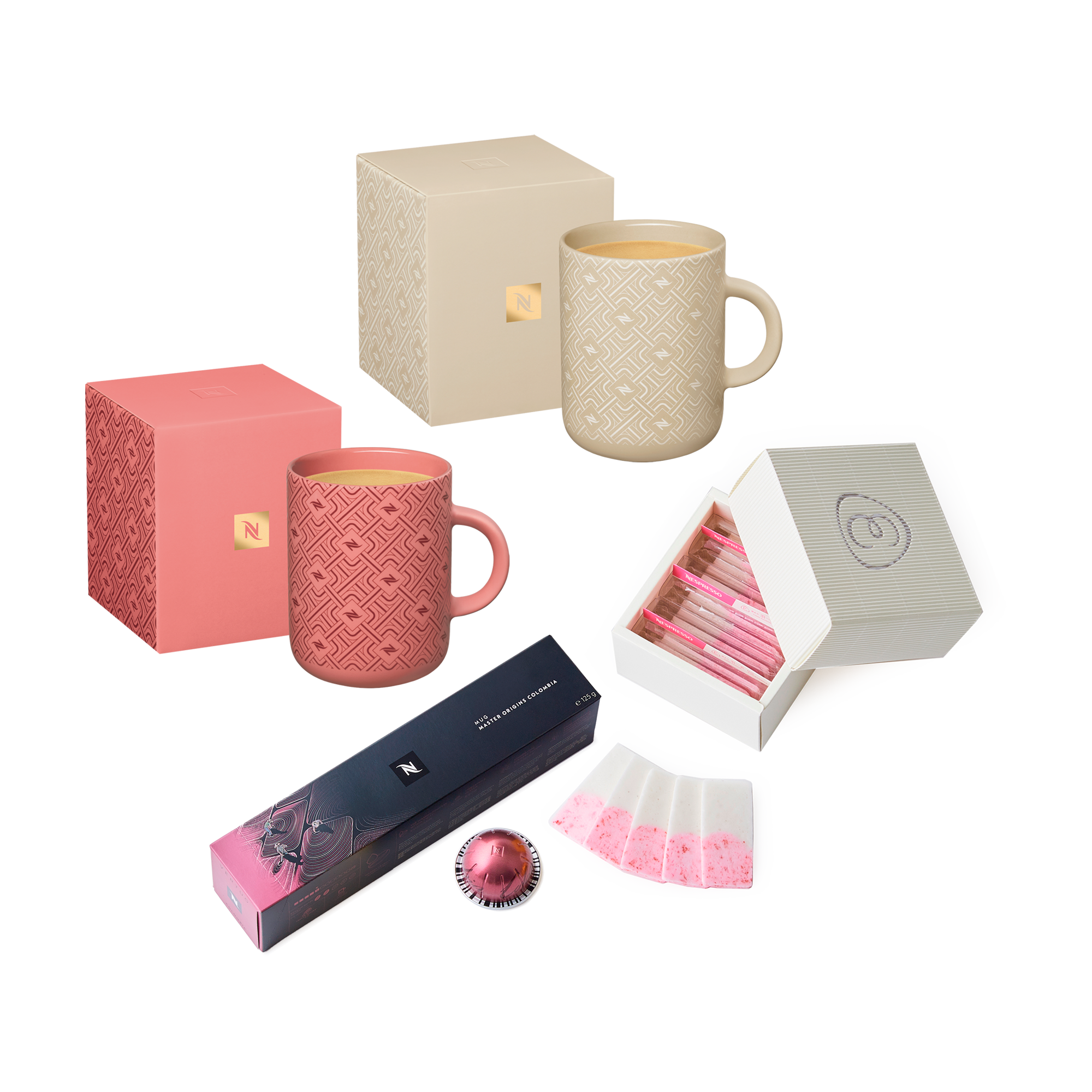 40周年限定デザインのマグカップ 2個(ストロベリー、パーチメント 各1個)、コーヒー、コーヒーとのペアリングにぴったりな「ネスプレッソ | あめやえいたろう ミルク×ストロベリー」の数量限定特別セット。
