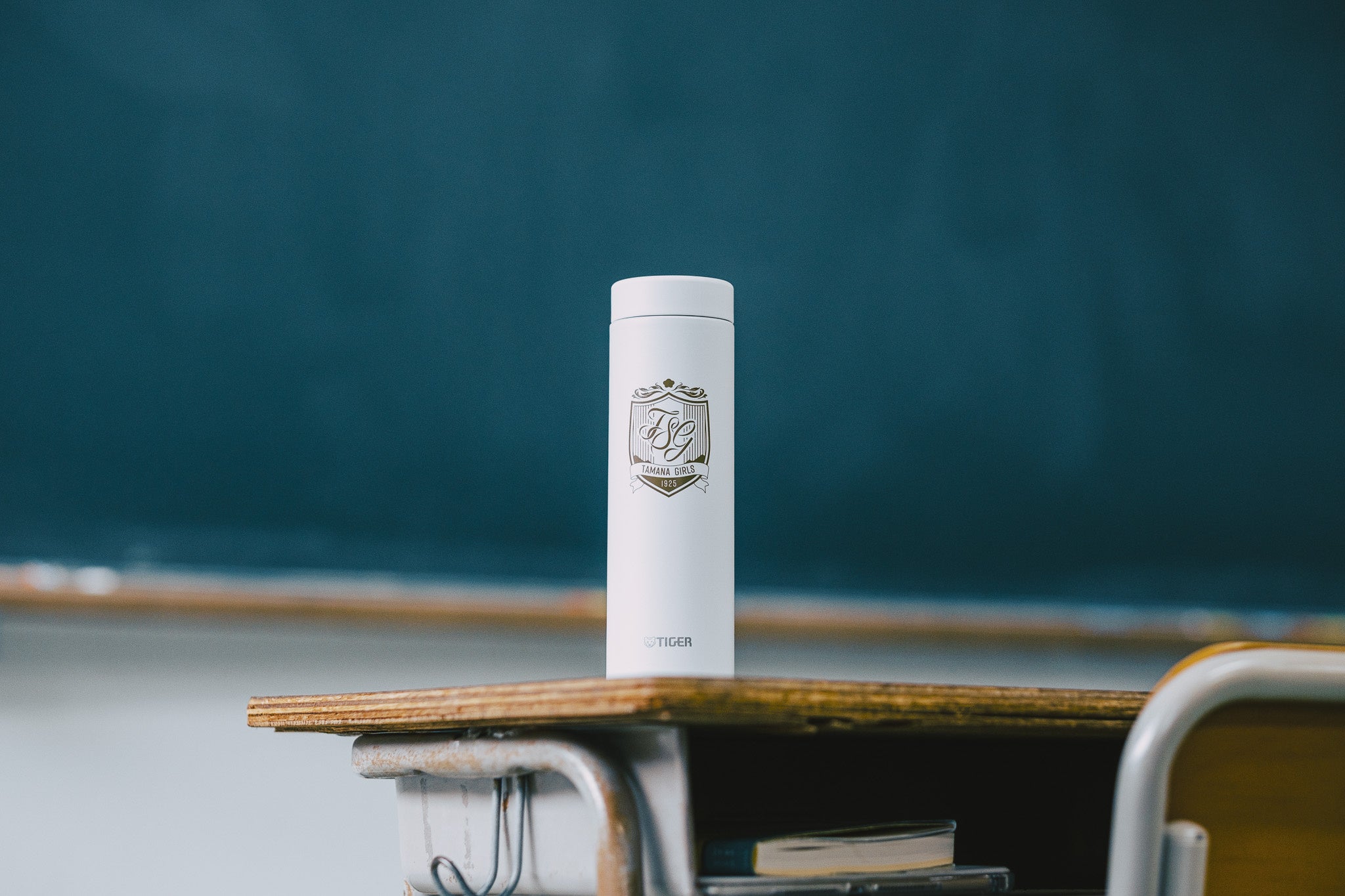 今回タイガー魔法瓶が、玉名女子高等学校の卒業生に贈呈したボトルには、玉名女子高等学校の創立100周年の記念ロゴデザインを施しています。ロゴのカラーは白色のボトルに似合う色を、先生がこだわってセレクトされました。