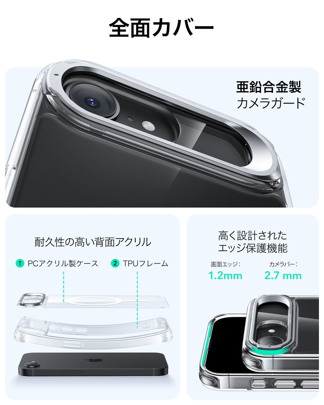 高く設計されたエッジ保護機能: スクリーンエッジでは1.2mm、カメラガードは2.7mm高く設計されており、衝撃やキズからしっかりガードします。