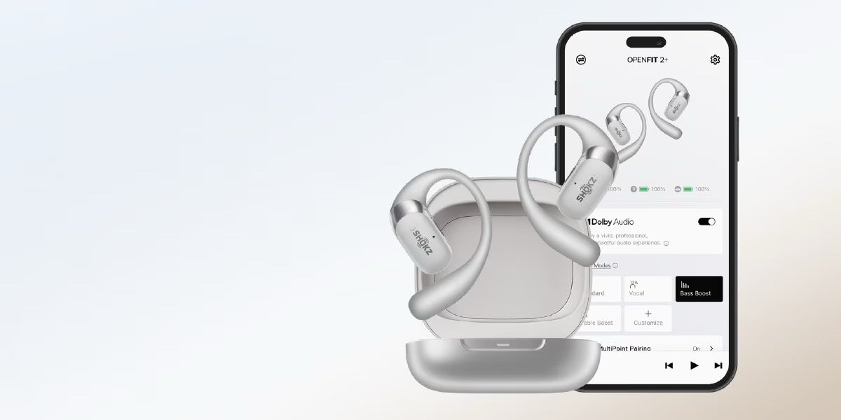 Shokzアプリのカスタマイズ機能を使用して、自分好みにリスニング体験を調整できます。Shokzアプリをダウンロードして、OpenFit 2+をペアリングすることで、Dolby Audioのオンオフ、マルチポイント接続、イコライザモード、ボタンのカスタマイズ機能の設定はもちろん、リアルタイムにバッテリー情報の確認やファームウェアのアップデートも可能です。イヤホンに関する必要なことは、すべてひとつのアプリで管理できます。
