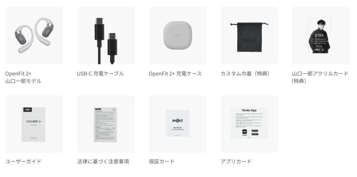 Shokz OpenFit 2+ 山口一郎モデルイヤホン、USB-C充電用ケーブル、充電ケース、カスタム巾着、山口一郎アクリルカード、ユーザガイド類、保証書