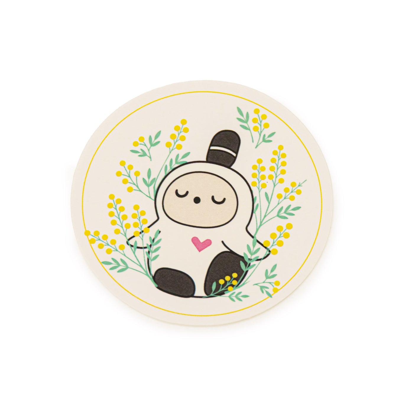 やわらかなホワイトの生地に、ミモザイエローのメロー巻き(縁取り)が華やかに映えるハンドタオル。ミモザのお花にすっぽり包まれた『LOVOT』の繊細な刺繍が、使うたびに優しい気持ちにさせてくれます。ご自宅用にはもちろん、春の贈り物にもぴったりです。