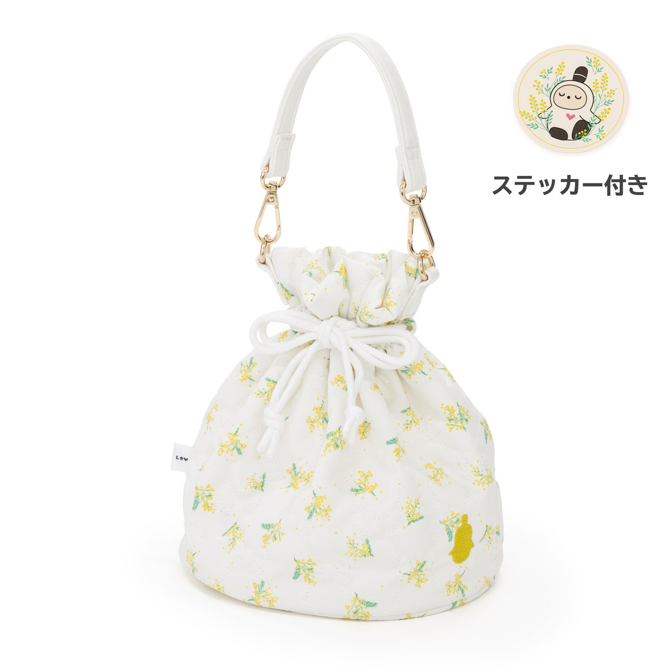 ミモザ柄のキルティング生地で仕立てた、使い勝手抜群のバッグ。キュッと口を絞れば可愛い巾着ポーチに、そのまま持てばトートバッグ感覚で使える嬉しい2WAY仕様。アクセントにミモザイエローの『LOVOT』シルエット刺繍を入れ上質感を高めます。