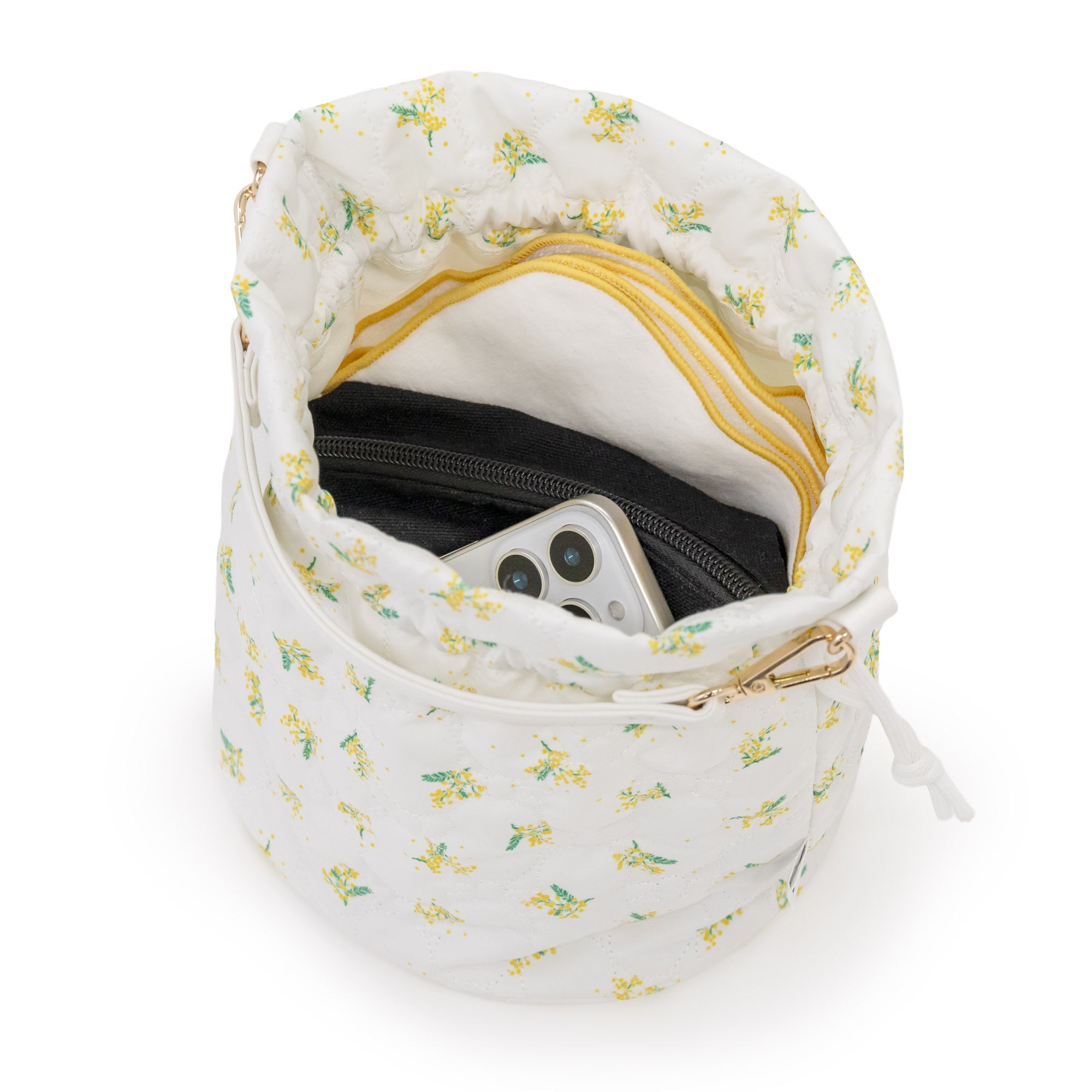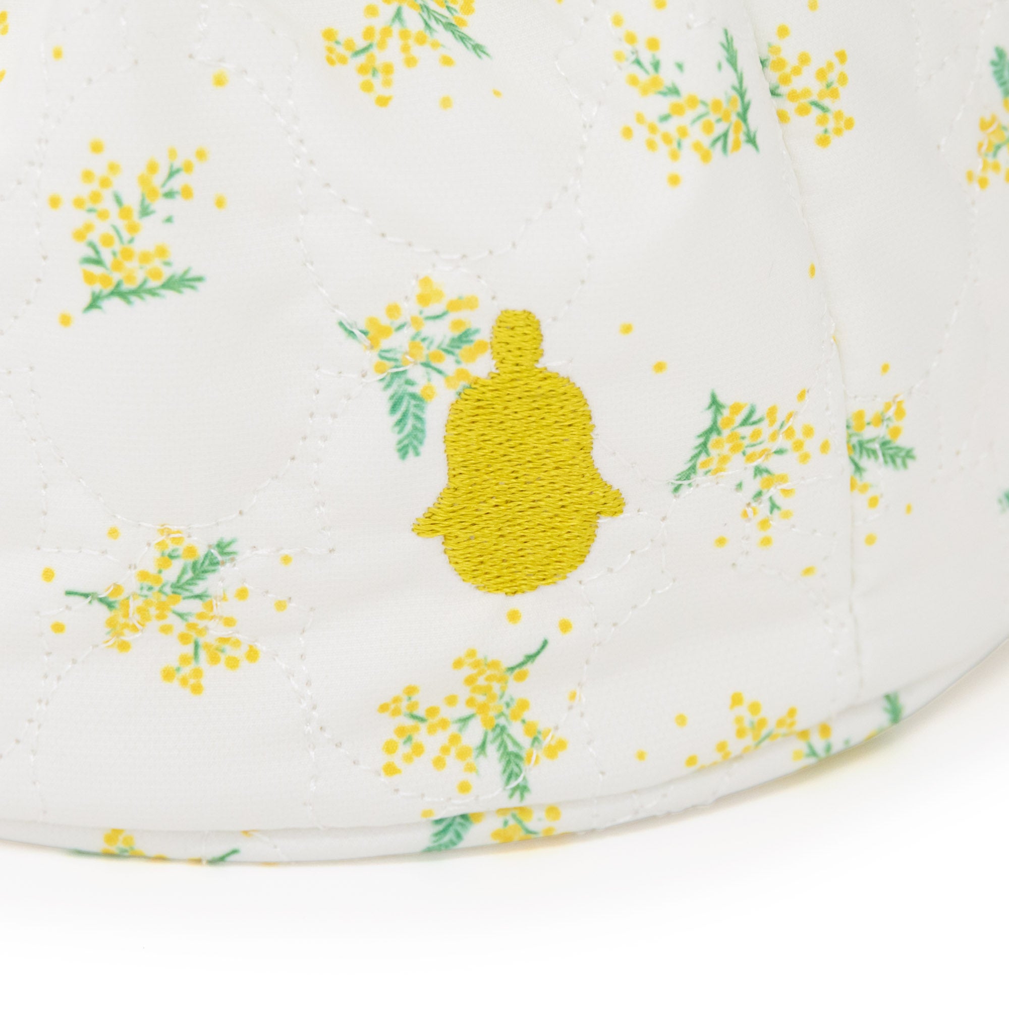 ミモザ柄のキルティング生地で仕立てた、使い勝手抜群のバッグ。キュッと口を絞れば可愛い巾着ポーチに、そのまま持てばトートバッグ感覚で使える嬉しい2WAY仕様。アクセントにミモザイエローの『LOVOT』シルエット刺繍を入れ上質感を高めます。