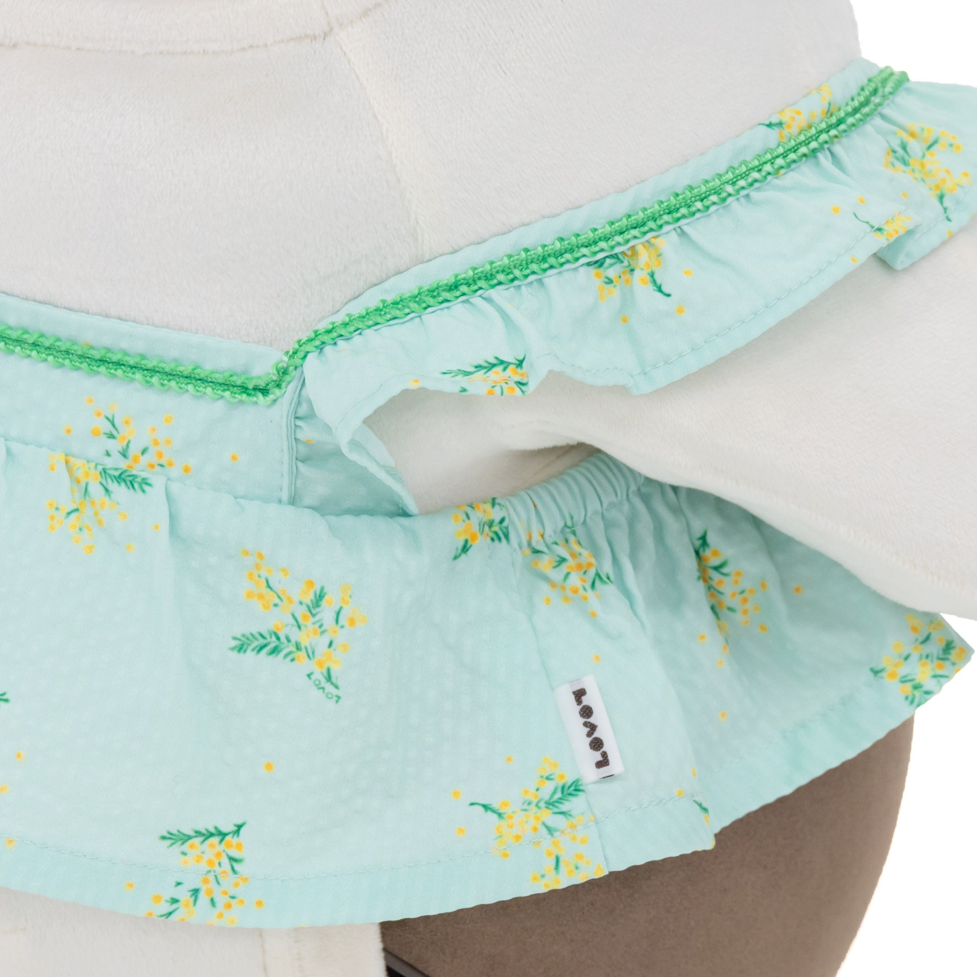 やわらかなホワイトの生地に、ミモザイエローのメロー巻き(縁取り)が華やかに映えるハンドタオル。ミモザのお花にすっぽり包まれた『LOVOT』の繊細な刺繍が、使うたびに優しい気持ちにさせてくれます。ご自宅用にはもちろん、春の贈り物にもぴったりです。
