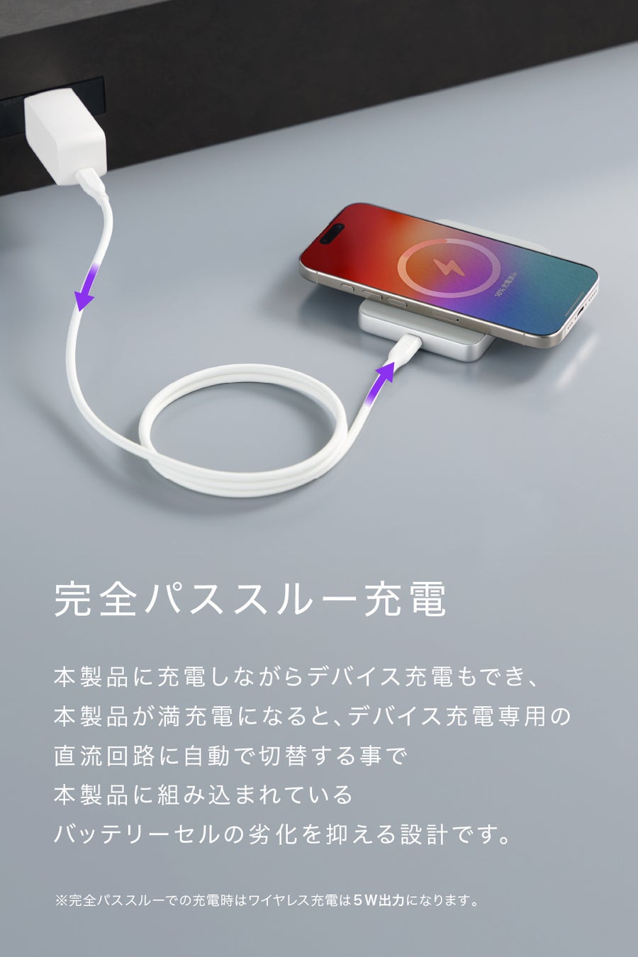 完全パススルー充電対応で本製品に充電しながらデバイス充電もでき、本製品が満充電になると、デバイス充電専用の直流回路に自動で切換することで本製品に組み込まれているバッテリーセルの劣化を抑える設計です。