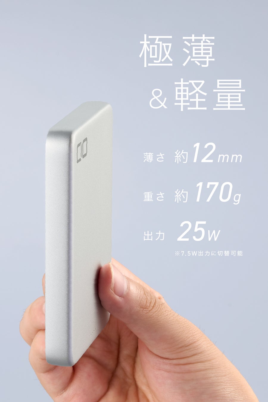 本製品は、8000mAhの容量を備えた薄型モバイルバッテリーです。薄さ約12mm・重さ約170gとスリムかつ軽量で、スマートフォンと重ね持っても違和感のないサイズ感を実現しました。Qi2.2規格のワイヤレス充電は最大25Wに対応し、MagSafe対応iPhoneにマグネット吸着し安定した給電が可能です。さらに、出力を切り替えられる2種類のモードを搭載(「ハイパフォーマンスモード」と