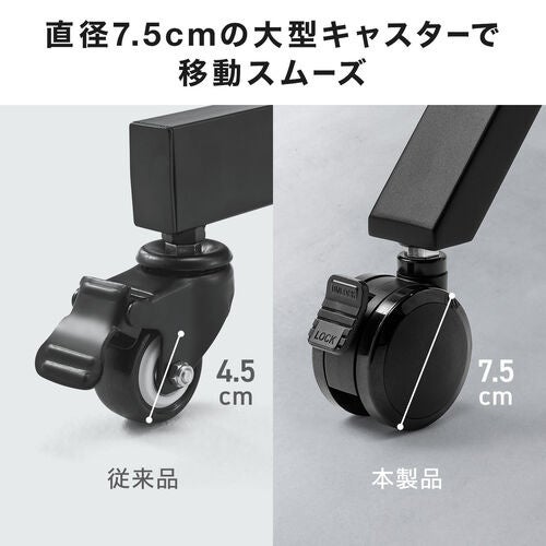 直径75mmの大型キャスターを採用し、重量のある大型ディスプレイでもスムーズに移動できます。4輪すべてにストッパーを備えているため、設置場所でしっかり固定することも可能です。会議室間の移動やセミナー会場での設置変更など、柔軟な運用をサポートします。
