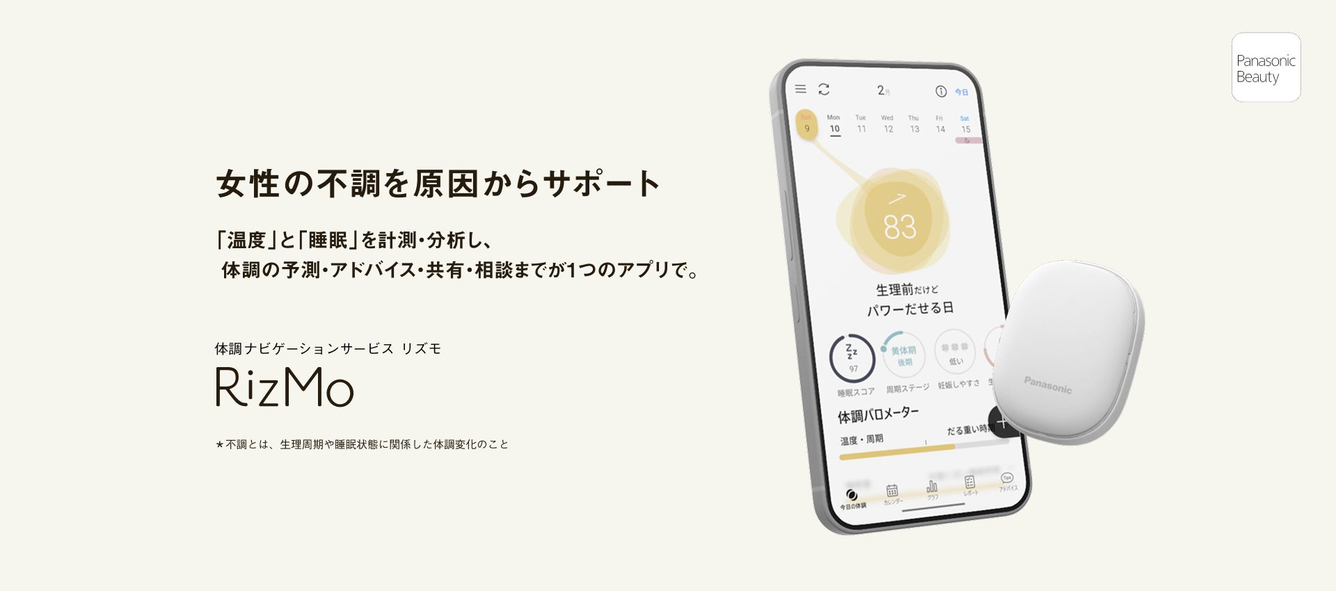 女性の不調(※1)を原因からサポートする「体調ナビゲーションサービス RizMo」(以下リズモ)。月経リズムと連動する衣服内温度と睡眠状態を計測できるウエアラブルデバイス「リズムモニター」と専用アプリケーション(※2)を通じて、計測データの確認や、独自のデータ分析アルゴリズムによる、その日や先々の体調予測、自身に合った体調サポートアドバイス等を確認することが可能です。また、日記のように手軽に心身の状態を記録できます。さらに計測・記録したデータをもとに、自身の生理周期毎のパーソナル体調レポートも自動生成されるため、心身の状態や傾向を振り返って客観的に見ることもできます。看護師・薬剤師・臨床心理士など50名を超える専門家によるオンライン健康相談やLINEを活用したパートナー共有機能など、女性の健康を支える機能も搭載しています。具体的な悩みを専門家に直接テキストやZoomで相談したり、体と心の状態をアプリでパートナーに知らせることで、自身の体調管理だけではなく、メンタルヘルスのセルフケア、家族やパートナーとのコミュニケーションにも役立てることができます。