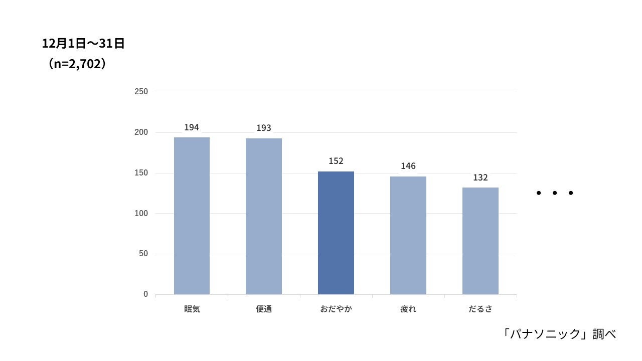 また、一定期間において、「おだやか」と記録された心身状態の件数割合に差異が確認されました。2025年9月1日〜30日の集計期間では、「おだやか」と記録された件数は記録総数6,386件中282件(4.4%)であったのに対し、2025年12月1日〜31日では、記録総数2,702件中152件(5.6%)となっています。