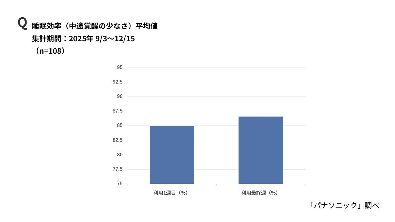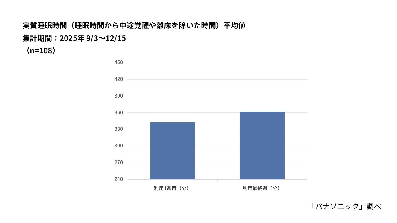当社は、体調ナビゲーションサービス「RizMo(リズモ)」の利用者が、専用アプリケーションを通じて記録および計測したデータを集計しました。その結果、睡眠に関する計測データについて、利用開始初週と利用最終週の平均値を比較したところ、数値に差がみられました。実質睡眠時間(睡眠中の中途覚醒および離床を除いた時間)の平均値は、初週342.8分、最終週361.9分でした。睡眠効率(中途覚醒割合を基に算出した指標)の平均値は、初週84.98%、最終週86.57%でした。(集計期間:2025年9月3日〜12月15日、有効データ数:N=108)