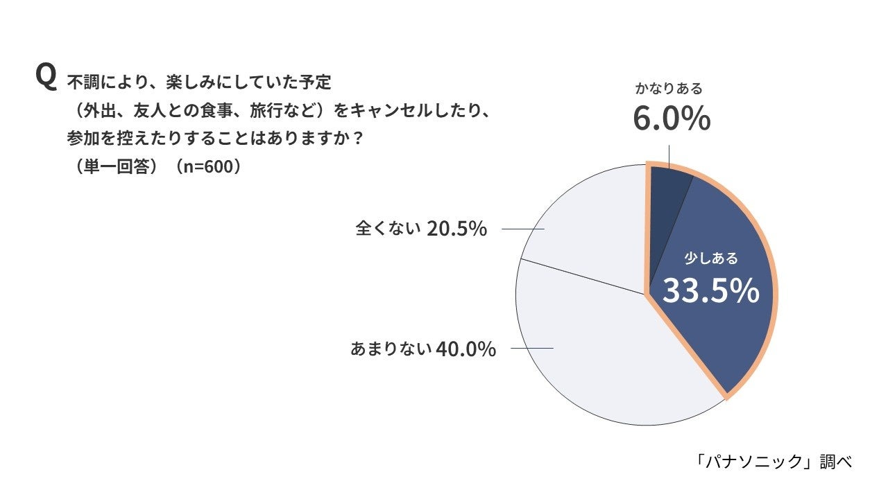 不調を感じた際、どのように対処することが多いか聞いたところ、「休養をとる」が53.5%で最も多く、次いで「薬を飲む」が52.8%となりました。一方で、「諦めて普段通り過ごす」が39.3%、「我慢する」が32.7%となり、不調は「受け入れざるを得ないもの」として捉えている人も多い結果となりました。また、「家族・友人などに相談する」は8.3%、「病院に相談する」は8.0%にとどまりました。周囲に助けを求めるのではなく、不調を自分一人で抱え込みがちな人も多くいることが分かりました。さらに、不調により楽しみにしていた予定をキャンセルしたり参加を控えたりすることはあるか聞いたところ、「かなりある」が6.0%、「少しある」が33.5%となり、合わせて39.5%に達しました。不調に対して我慢や諦めを選択した結果、プライベートにおける楽しみや機会への影響もあることが明らかになりました。