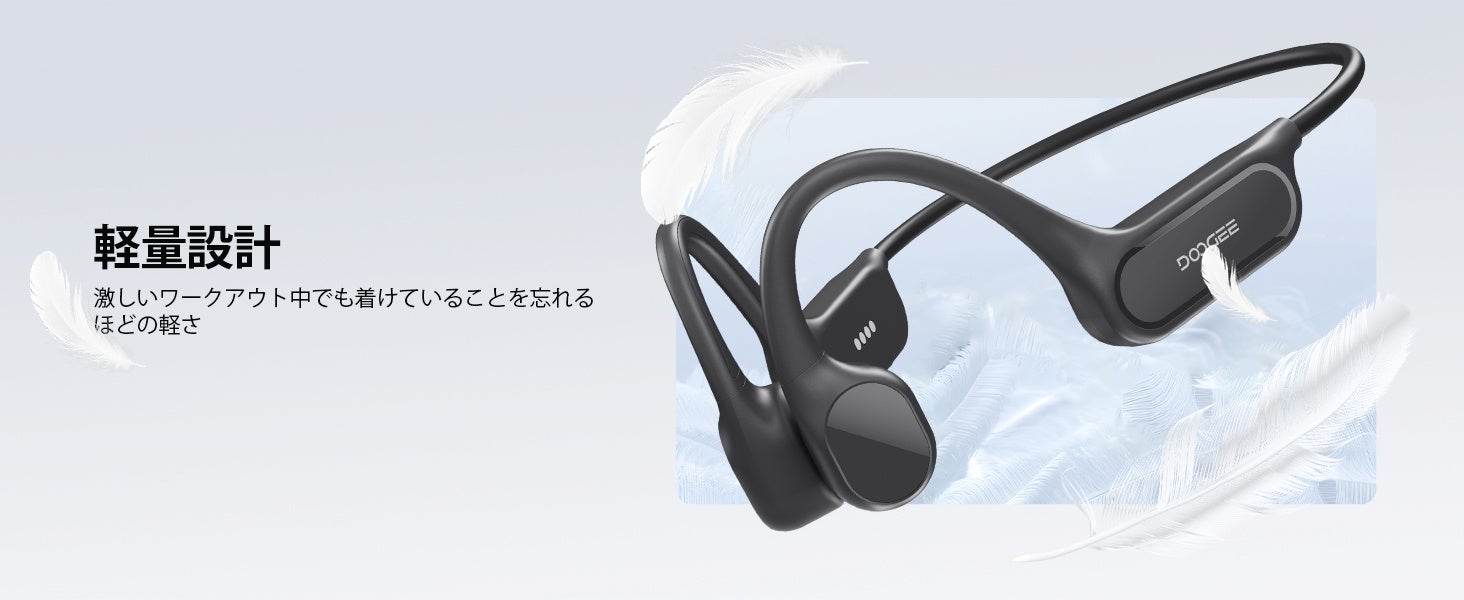 本体重量は約25gと軽量で、長時間のトレーニングでも負担になりにくい設計です。チタン合金メモリーワイヤーを採用しており、柔軟性と耐久性を両立しています。さらに物理ボタン操作により、水中や運動中でも確実なコントロールが可能です。最大約10時間の連続再生にも対応し、日常から本格的なトレーニングまで幅広くサポートします。