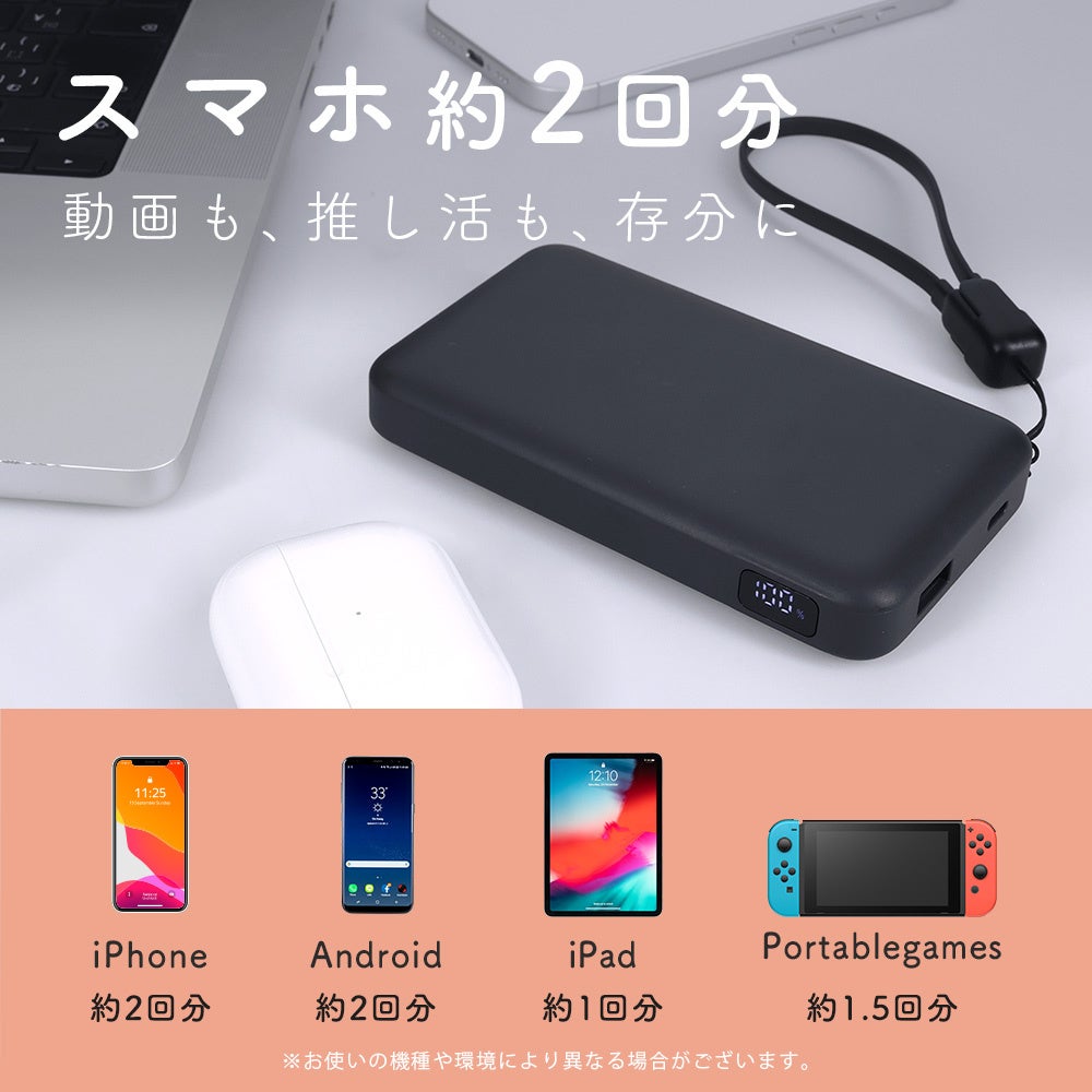 10,000mAhの大容量で、PD30W入出力対応。スマートフォンは約2回分、タブレットやMacBookAirなどの充電もこの一台で完結できます。