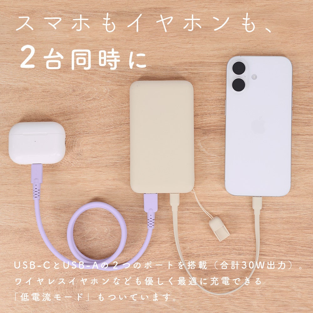 10,000mAhの大容量で、PD30W入出力対応。スマートフォンは約2回分、タブレットやMacBookAirなどの充電もこの一台で完結できます。