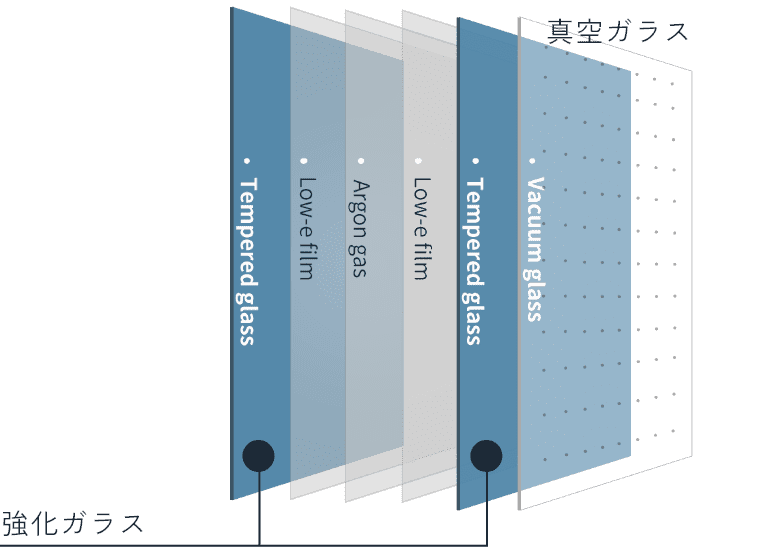「Low-Eガラス」は、2枚の強化ガラスの内側に「Low-Eフィルム」を施し、さらにガラス層の間にアルゴンガスを封入することで断熱性を高めた構造です。紫外線を防ぐUVカット効果も備え、ワインの保管環境にも配慮しています。