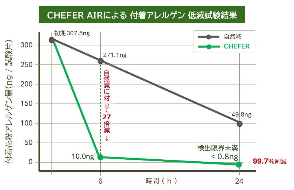 株式会社カーボントレード(本社:東京都港区)は、同社が開発・販売する空間除菌機「CHEFER AIR(シェファー・エアー)」について、付着したスギ花粉アレルゲンの低減効果を確認する第三者試験を実施いたしました 。その結果、6時間でアレルゲンを96.7%削減。24時間では検出限界未満(99.7%以上削減)まで低減する圧倒的な性能が確認されたことをお知らせいたします 。