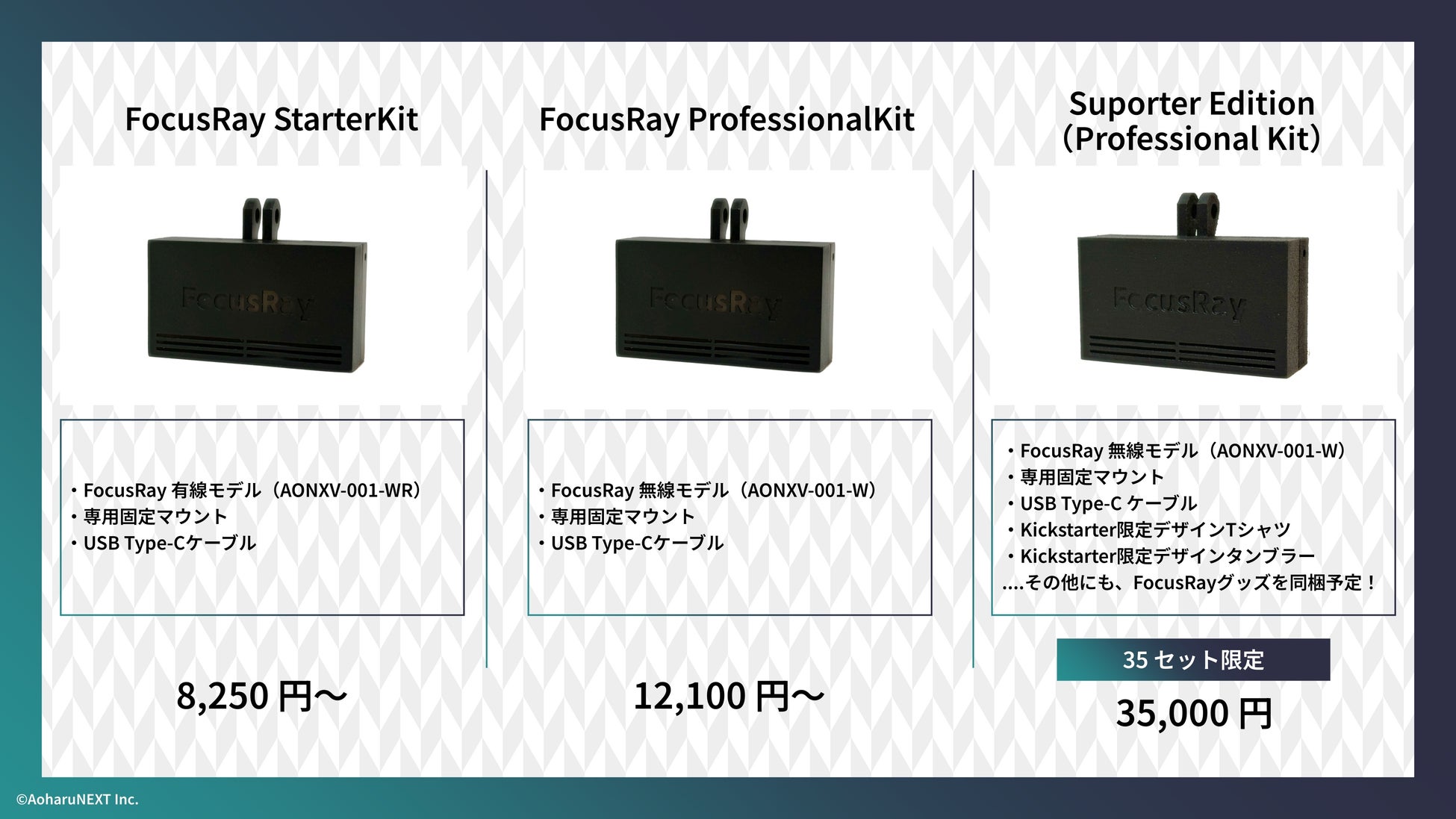 内容物:FocusRay無線モデル(AONXV-001-W)、USBタイプCケーブル、専用固定マウント、その他附属書類、Kickstarter限定デザインTシャツ、FocusRay ロゴタンブラー、その他オリジナルグッズ