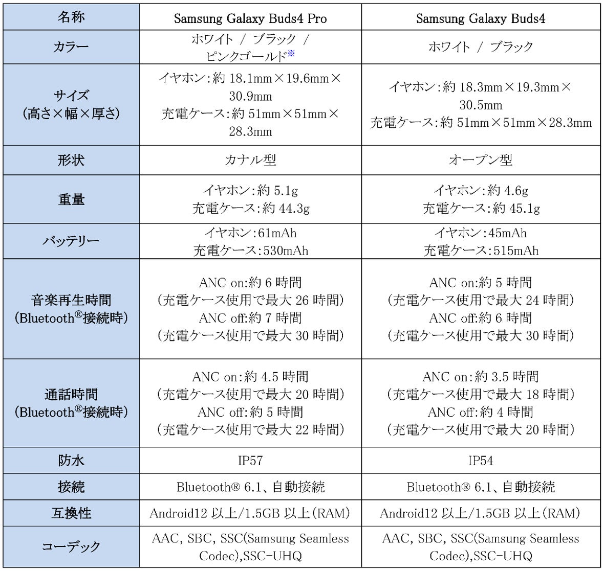 <主な仕様 : 「Samsung Galaxy Buds4 Pro」「Samsung Galaxy Buds4」>