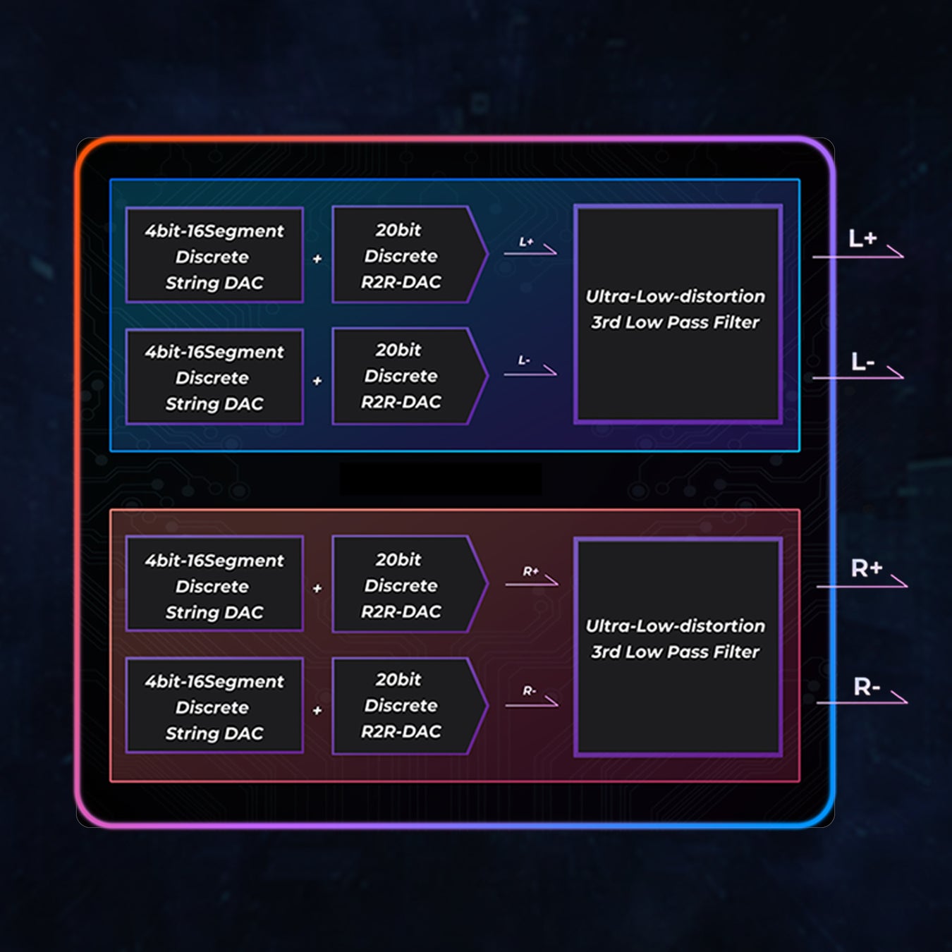 「20bit R2R + 4bitストリングDACのハイブリッドR2Rアーキテクチャ」を採用し、フルバランス8ch完全差動回路、FPGA Master3.0テクノロジーとハードウェア抵抗補償ネットワークを組み合わせています。