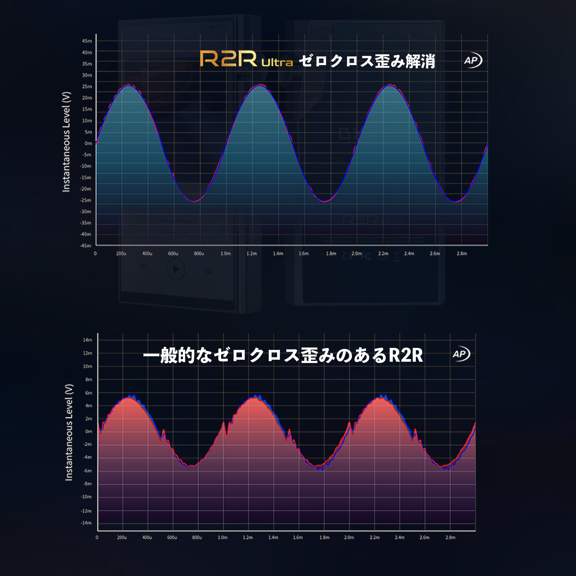 DNRは>130dB、THD+Nは-97dBを上回るフラッグシップクラスの性能を実現しながらも、R2Rデバイス特有の信号がゼロを通過する際の歪み(ゼロクロス歪み)問題を一掃し、微小な信号でも安定した線形性を確保し、完璧に近い直線性(リニアリティ)を実現しています。