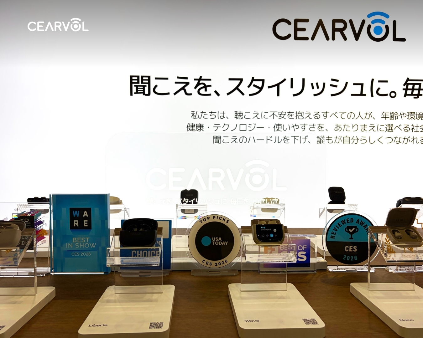 会場では、軽度から中等度の聴こえのサポートを必要とする方々の日常的なリスニング体験の向上を目的として開発された、次世代のOTC(Over-the-Counter)聴覚増幅デバイスを紹介しました。これらの製品は、先進的な音響技術とユーザーフレンドリーな設計、そして快適な装着性を組み合わせるというCearvolの製品開発方針を反映しています。
