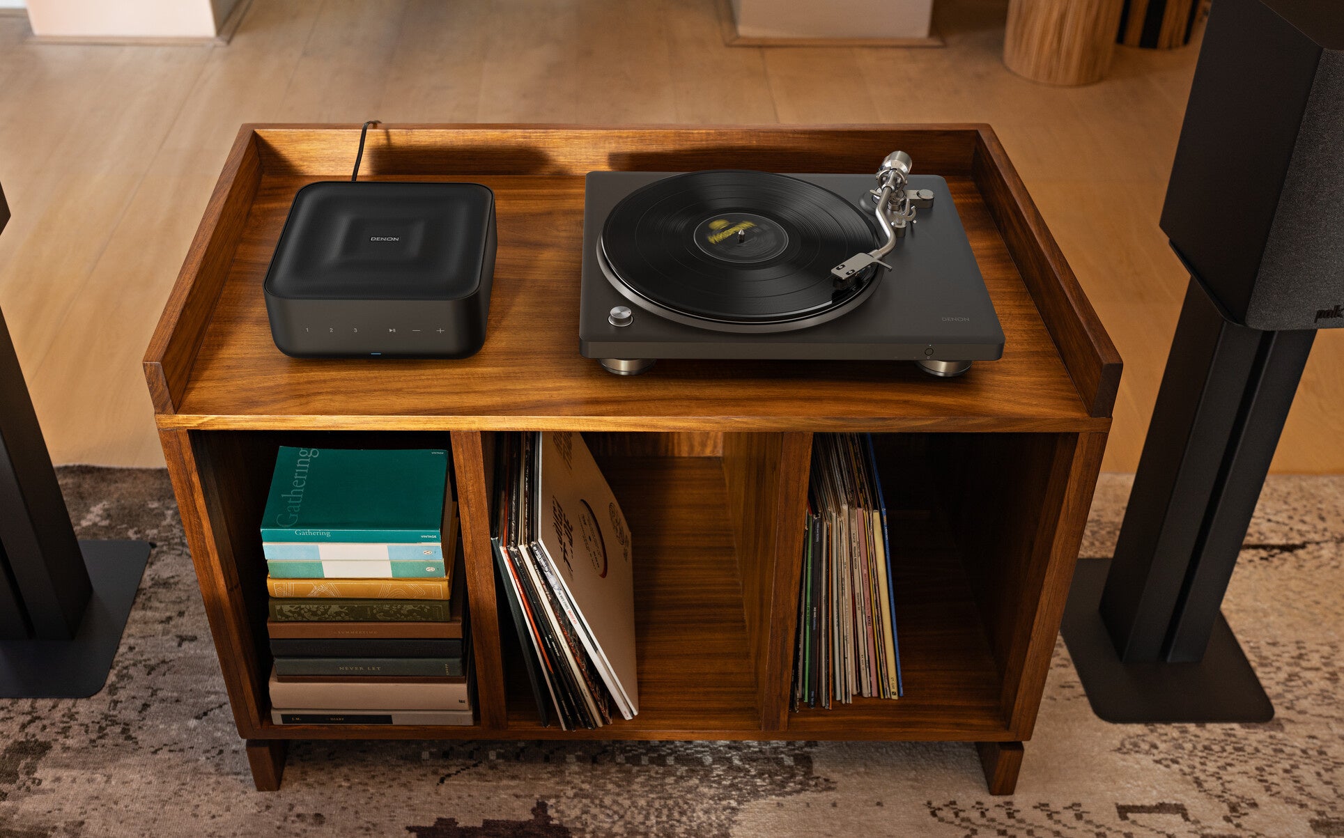 DP-500BTは、デノンの伝統をただ継承するだけの製品ではありません。新たにBluetooth送信機能を搭載することにより、レコードの楽しみ方をさらに発展させるプレーヤーでもあります。単体機やアンプ内蔵のフォノイコライザーに匹敵する高音質を誇る新開発の内蔵フォノイコライザーとaptX Adaptiveなどの高音質なコーデックを組み合わせることで、ワイヤレスでも有線接続に匹敵するクオリティのレコード再生を可能にしました。これによって、レコードプレーヤーと接続するオーディオ機器は、これまでのように並べてレイアウトする必要がなくなります。手元での操作が必要なレコードプレーヤーは近くに置き、コンポやスピーカーは離れた場所に配置することも可能です。もちろんBluetooth対応のイヤフォンやヘッドフォンでレコードを楽しむこともできます。音量調整はDP-500BTのフロント右側のボタンからでも、接続したオーディオ機器からでもできるため、音量調整機能を持たない完全ワイヤレスイヤフォンのような機器でもお使いいただけます。