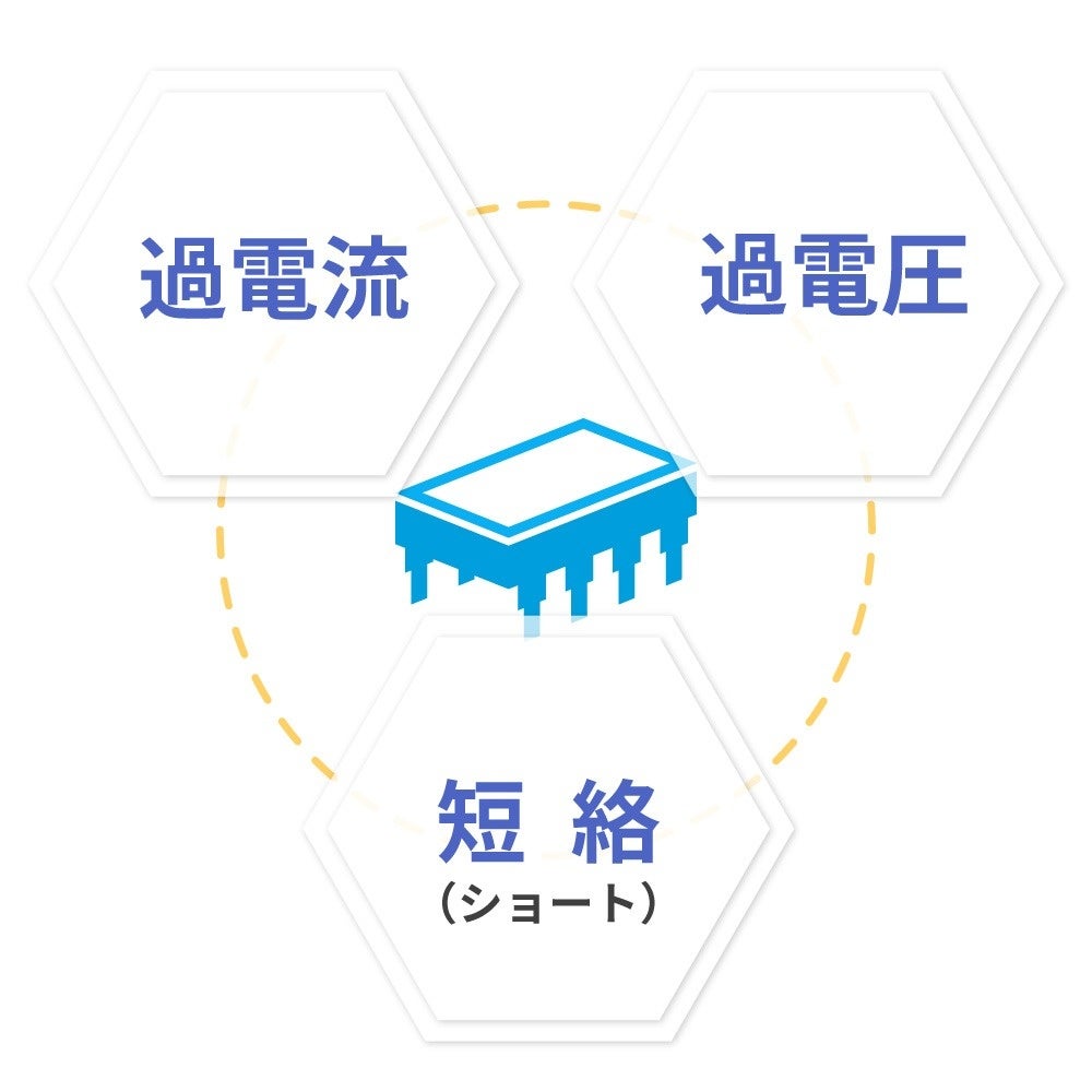 保護機能の「過電流保護」「過電圧保護」「短絡(ショート)保護」を搭載し、高い安全性を備えています。過電流・過電圧・短絡(ショート)発生時に動作を止めることで、万が一の事故を未然に防ぎます。