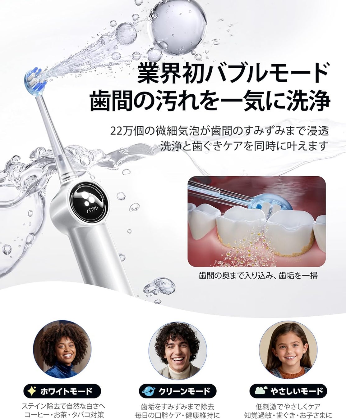 この気泡が歯の表面や歯間に触れると破裂し、その際に生じる微細な衝撃によって歯垢や汚れを浮かせて洗い流します。