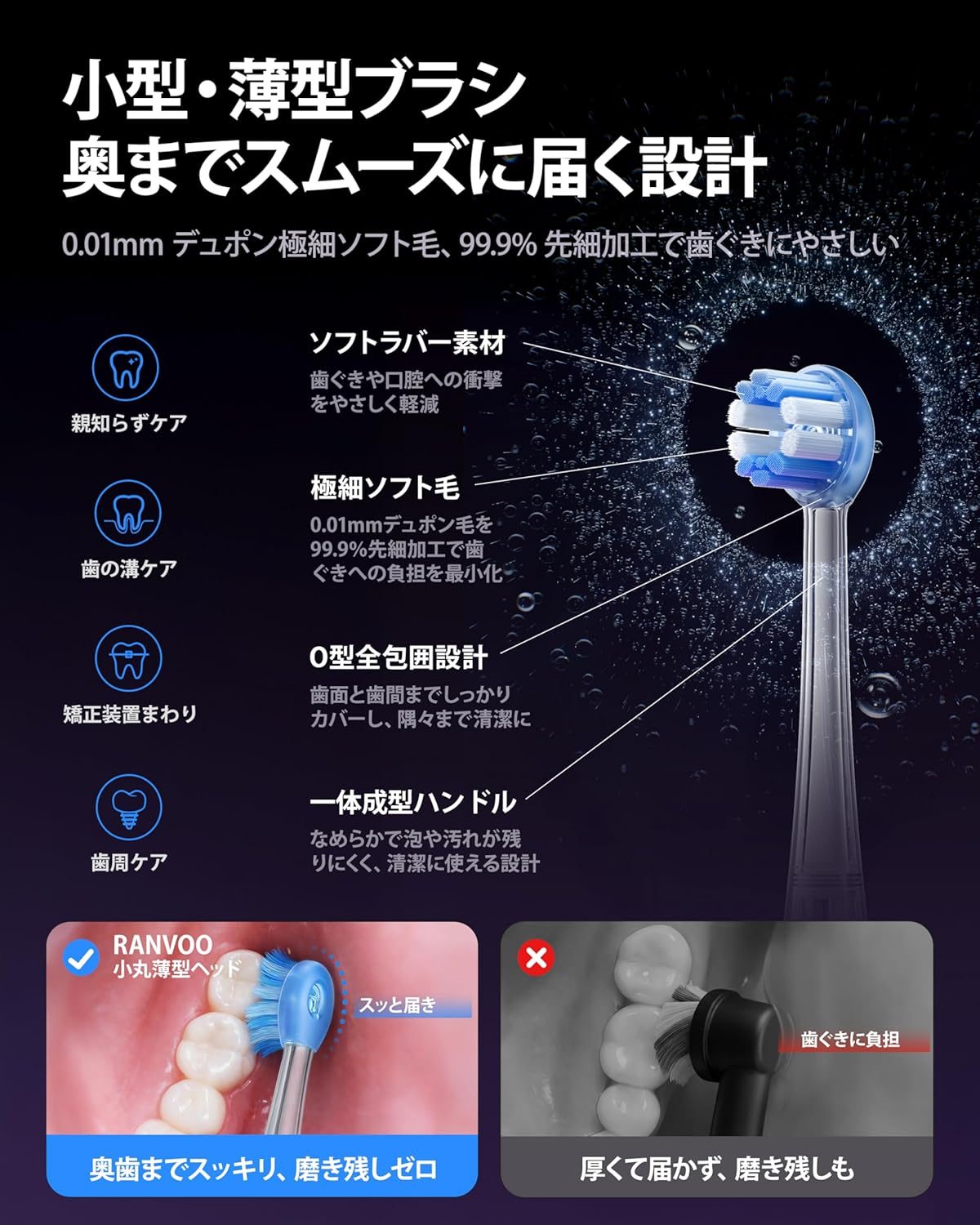 また、O型ブラシヘッドを採用し、奥歯や歯の裏側など、磨きにくい部分にもフィットしやすい設計となっています。