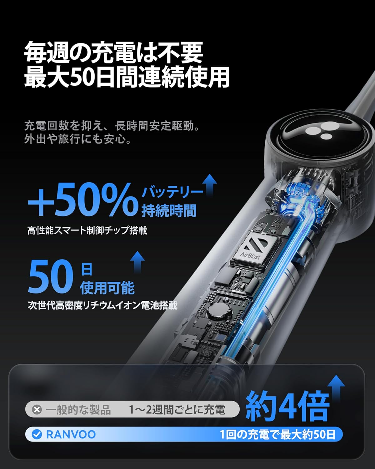 1600mAhの大容量バッテリーを搭載し、1回の充電で最大約50日間使用可能。旅行や出張にも便利です。