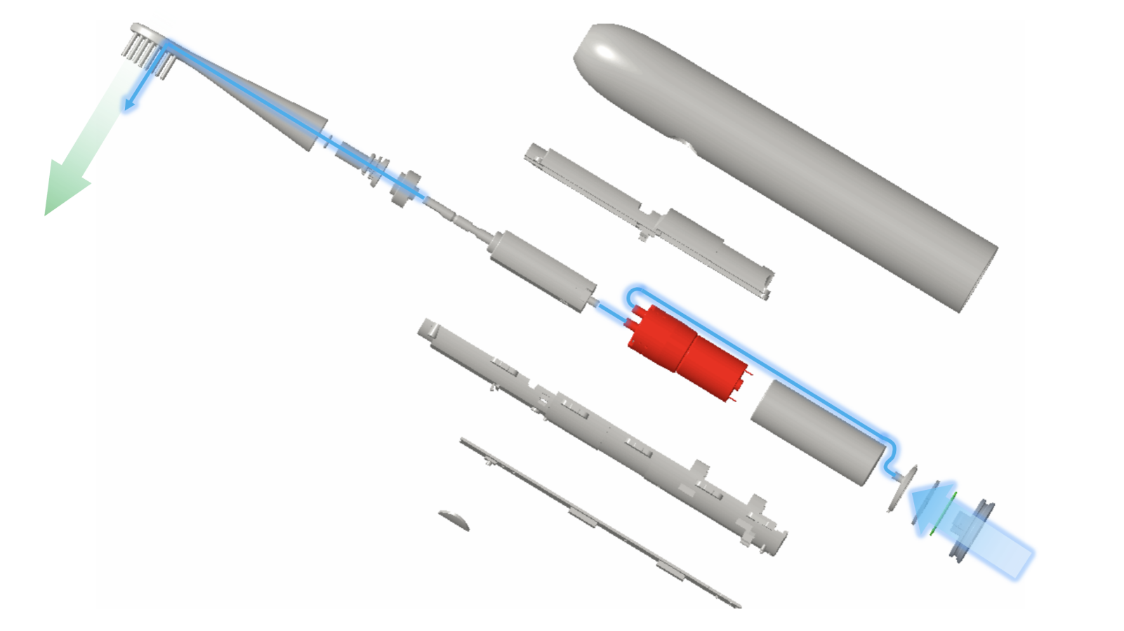 電源を入れると、本体下部から取り込まれた空気が内部のポンプによってブラシヘッドへと送り込まれます。ブラシヘッドには圧力を高めるための増圧構造が採用されており、内部で空気圧が高まり、ジェット状の空気流を生み出します。