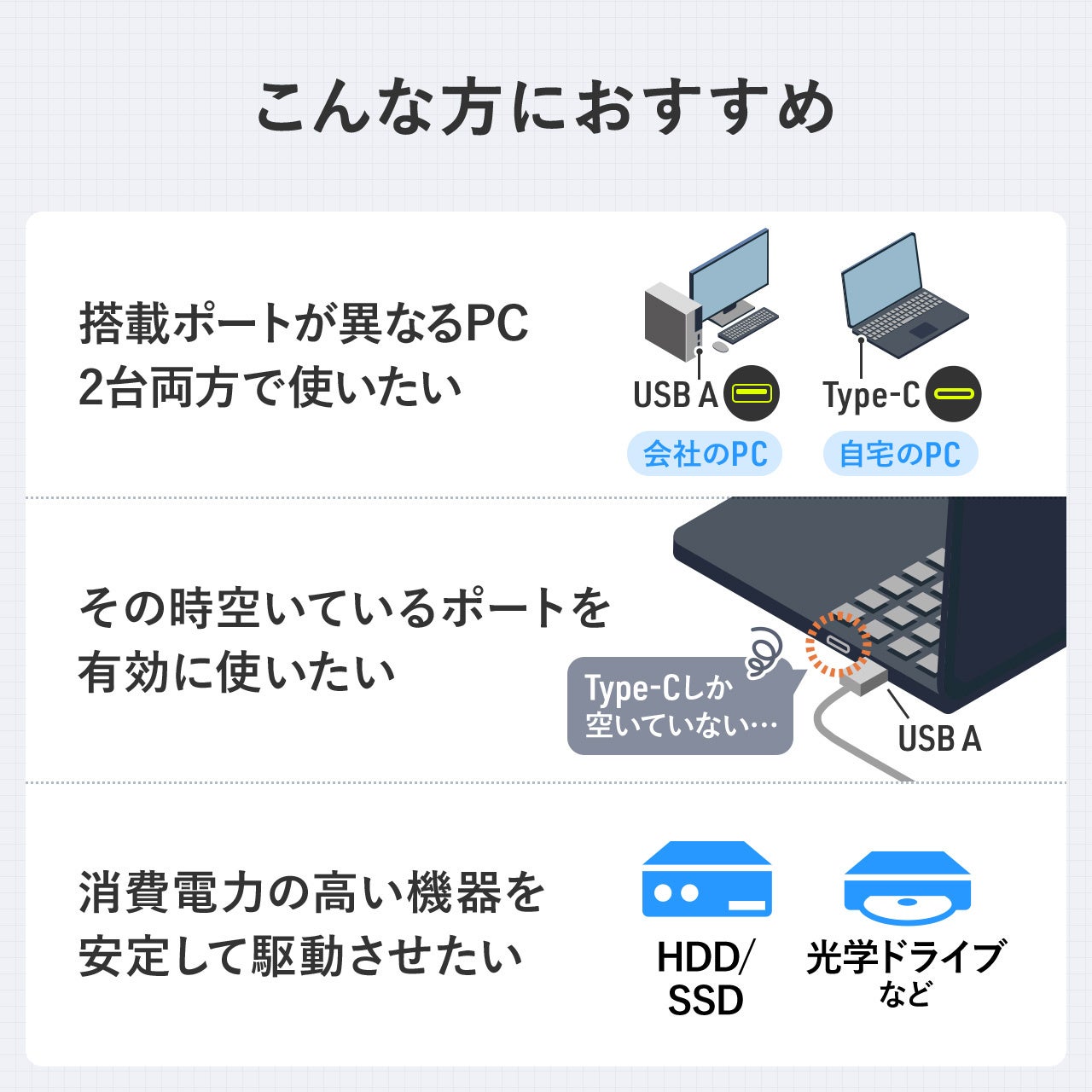 USB A・Type-Cの両方に対応しているため、会社でも自宅でも、異なるPCにそのまま接続できます。マウスやキーボード、USBメモリはもちろん、セルフパワーにも対応しているため、HDD/SSDや光学ドライブなど消費電力の高い機器も安定して使用可能。さまざまな機器・環境に幅広く対応できる1台です。