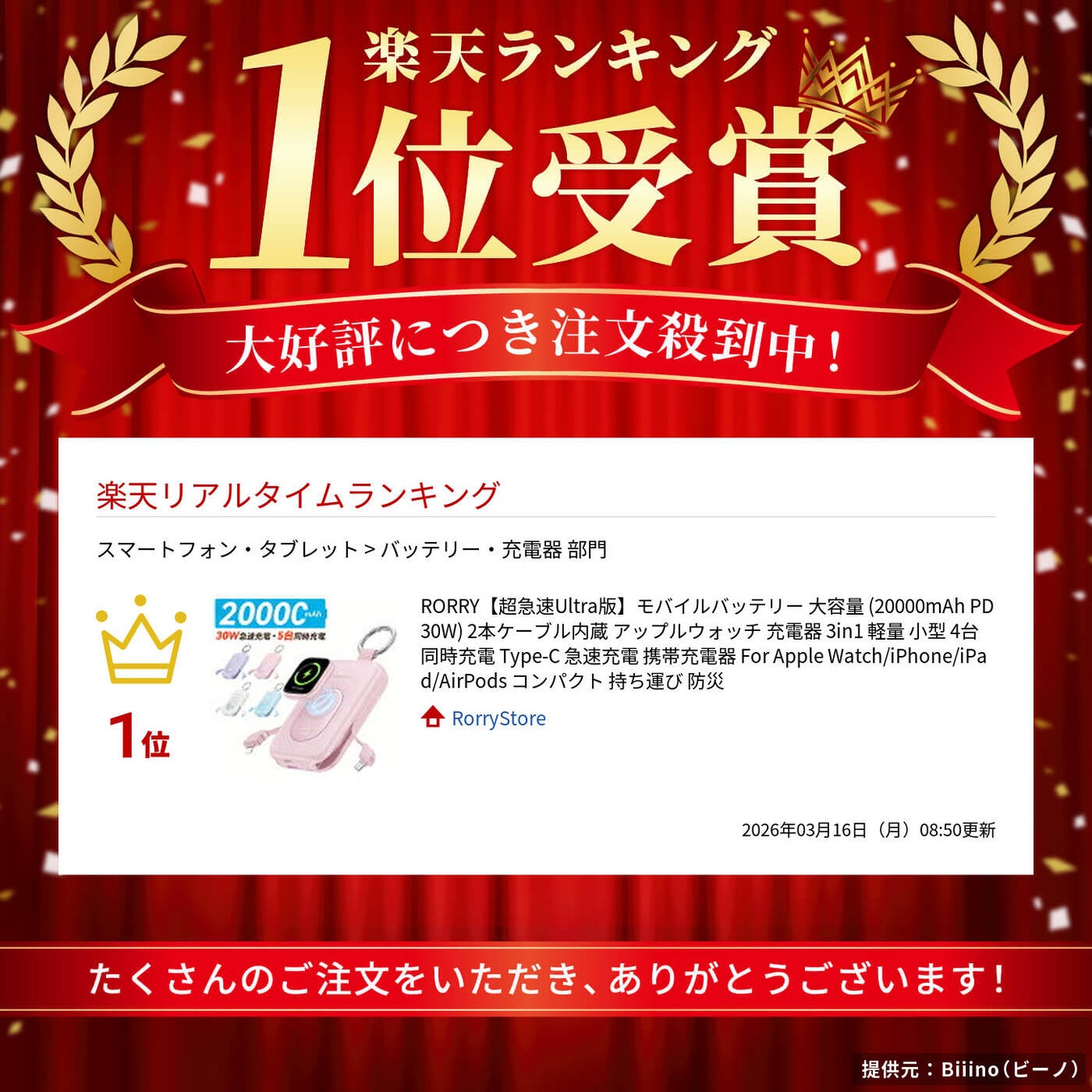 RORRY【超急速Ultra版】 大容量 (20000mAh PD30W) 2本ケーブル内蔵(D2-20000)