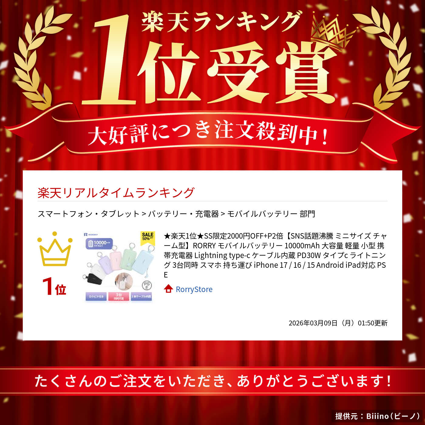 RORRY モバイルバッテリー 10000mAh 大容量 軽量 小型 携帯充電器 Lightning type-c ケーブル内蔵 PD30W(T1-10000)