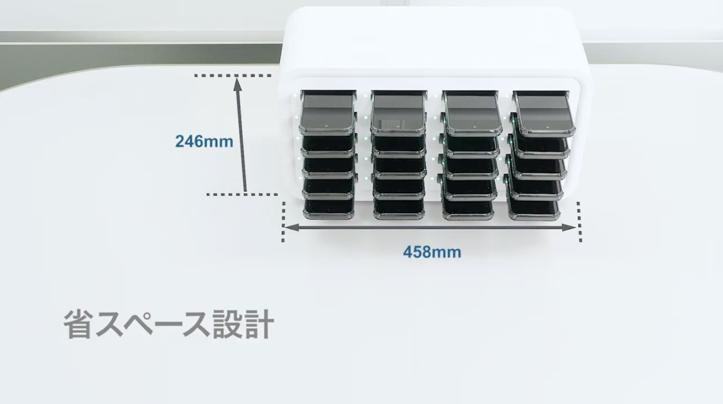 業務用スマートフォンを省スペースで20台同時充電。4〜6時間で満充電、ランプ表示で満充電状態を可視化し業務負荷を軽減します。
