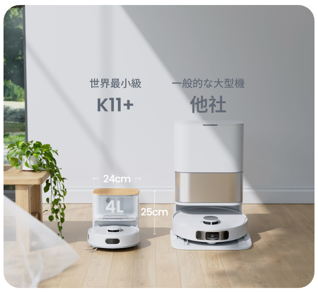 最新モデル「K11+」は、直径わずか24.8cmの超小型ボディに、最大6000Paの強力吸引を実現。LiDAR SLAMによる高精度マッピングで、清掃効率もさらに向上しました。さらに、天板には温かみのある木目のデザインを採用。機能性だけでなく、インテリアに自然と溶け込む佇まいにもこだわりました。