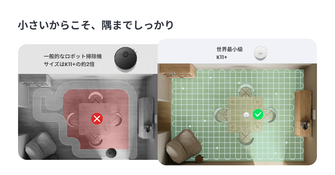 椅子やテーブルの脚まわり、家具の多い空間にも入り込みやすいコンパクト設計に加え、ゴミ収集ステーションを含めた省スペース設計により、Kシリーズは日本の住まいに寄り添うロボット掃除機として支持を集めてきました。さらに、吸引力やマッピング性能、デザイン性も継続的に進化させています。